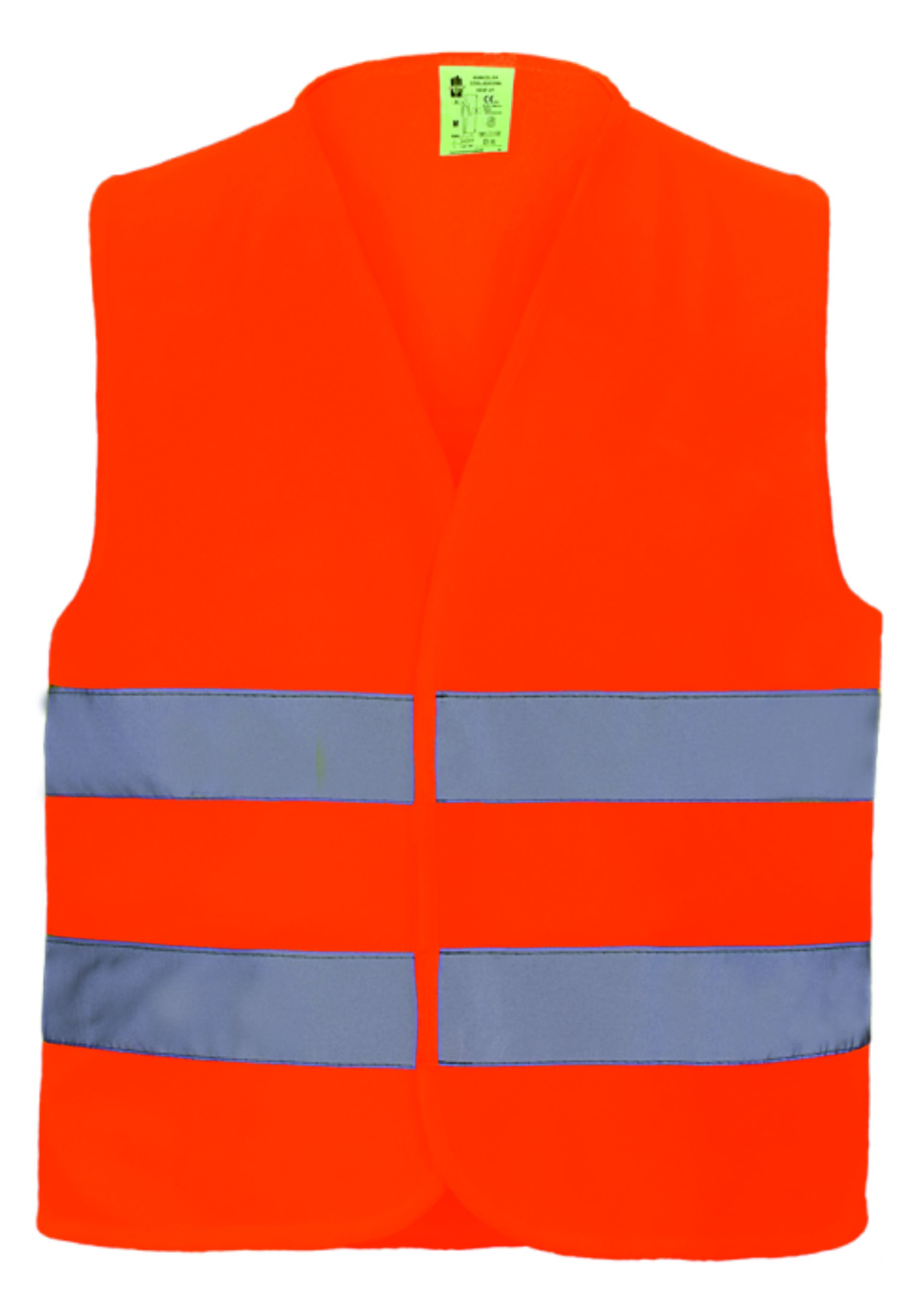 Kamizelka ostrzegawcza wykonana z wysokiej jakości poliestrowej dzianiny w kolorze pomarańczowym fluorescencyjnym z dwoma pasami odblaskowymi, zapinana z przodu na rzep.